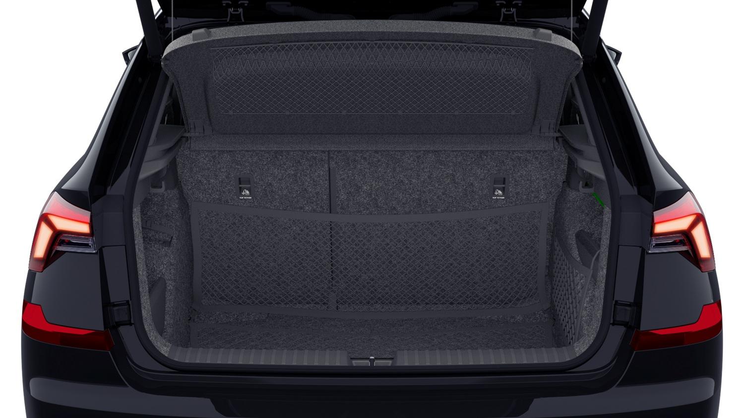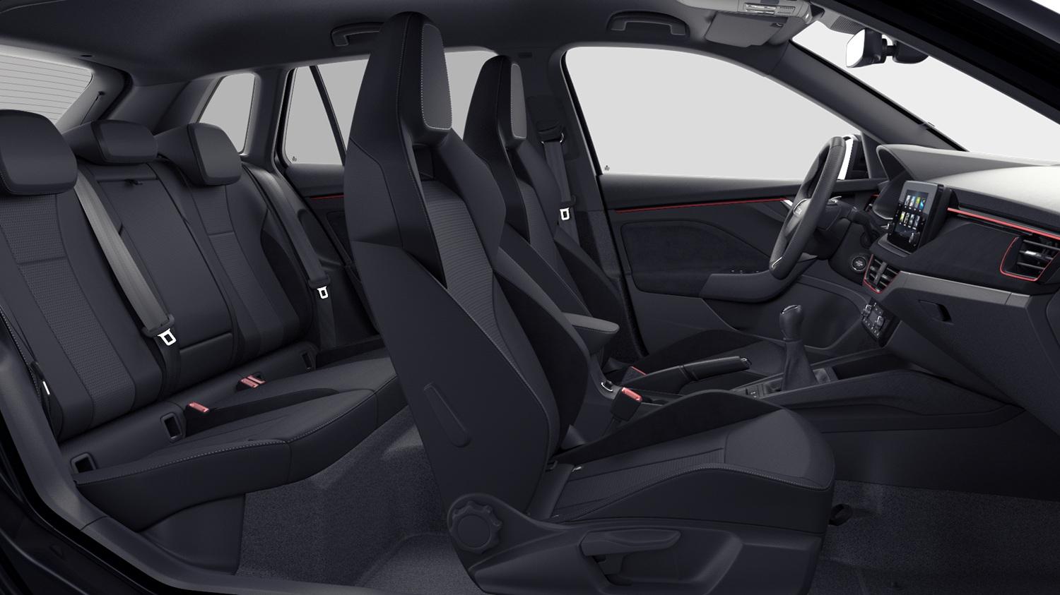 Innenausstattung Design Selection DYNAMIC Sportsitze mit Stoffbezüge Lodge Schwarz, Interieurleisten Schwarz und Luftausströmerumrandung, LED-Ambientebeleuchtung (2-farbig, Weiß oder Rot), Mittelarmlehne hinten, Pedalerie in Edelstahloptik, Einstiegsleisten mit Schriftzug "SCALA", 3-Speichen-Multifunktionslederlenkrad (bei DSG mit Schaltwippen)