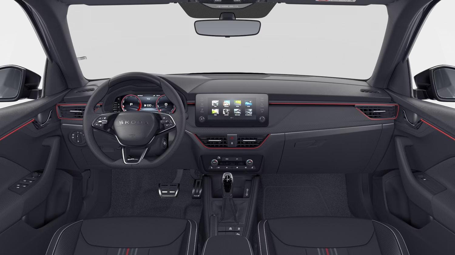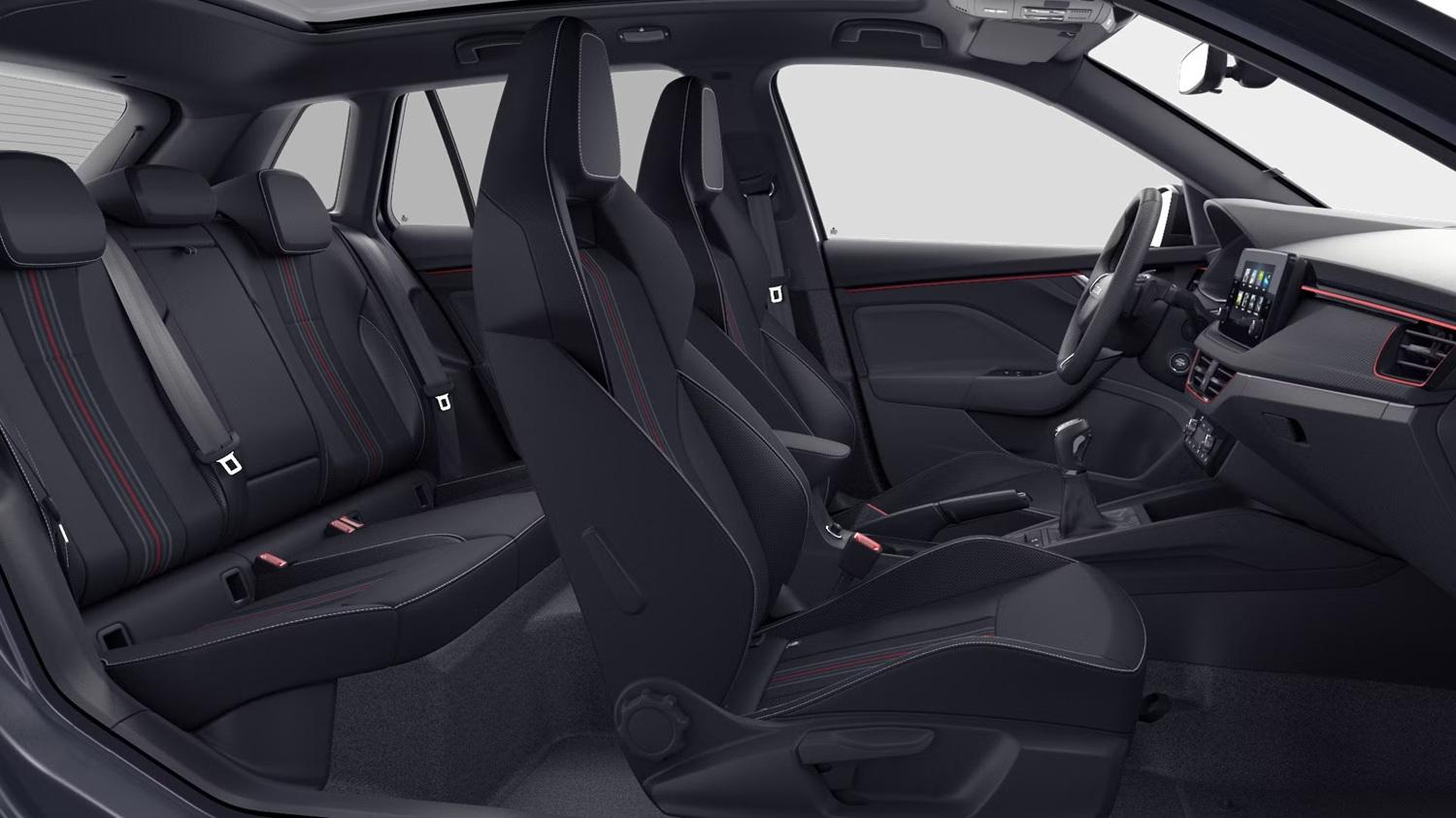 Innenausstattung Design Selection MONTE CARLO, Sportsitze vorn mit integrierten Kopfstützen, Stoffsitzbezüge Monte Carlo Schwarz/Rot/Grau, Dekor Monte Carlo Carbon, Interieurleisten und Luftausströmerumrandung Schwarz glänzend mit Kontrastline Rot, LED-Ambientebeleuchtung (2-farbig, Weiß oder Rot), Mittelarmlehne hinten, Türeinstiegsleisten vorn und hinten, Pedalerie in Edelstahl-Optik