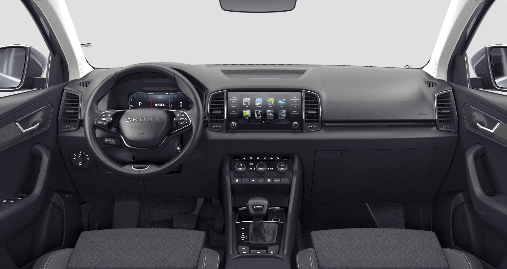 Innenausstattung Design Selections / Interieur Lodge: Komfortsitze in Stoff; Fahrprofilauswahl; Türöffner, Lichtschalter und Luftausströmer mit Chromrahmen; Dekor Armaturenbrett: Paint Piano Black; Dekor Türen: Linear Diamonds; Make-up-Spiegel mit LED-Beleuchtung (Fahrer- und Beifahrer-Sonnenblende); Dachhimmel grau
